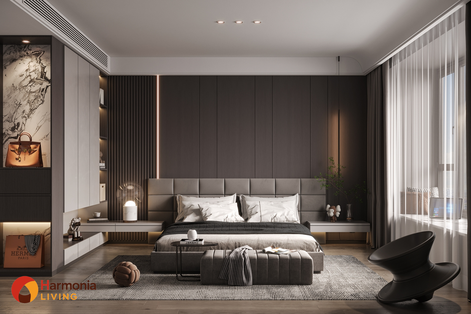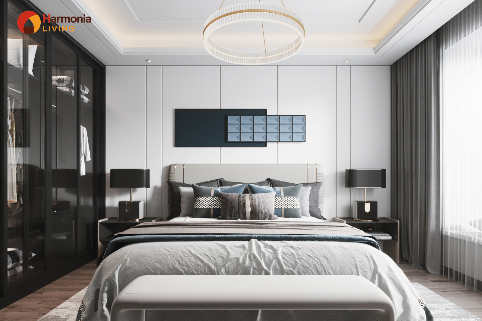 Trong Harmonia Living, phòng ngủ là không gian hồi phục sinh học, ánh sáng cần dịu – ổn định – có kiểm soát.