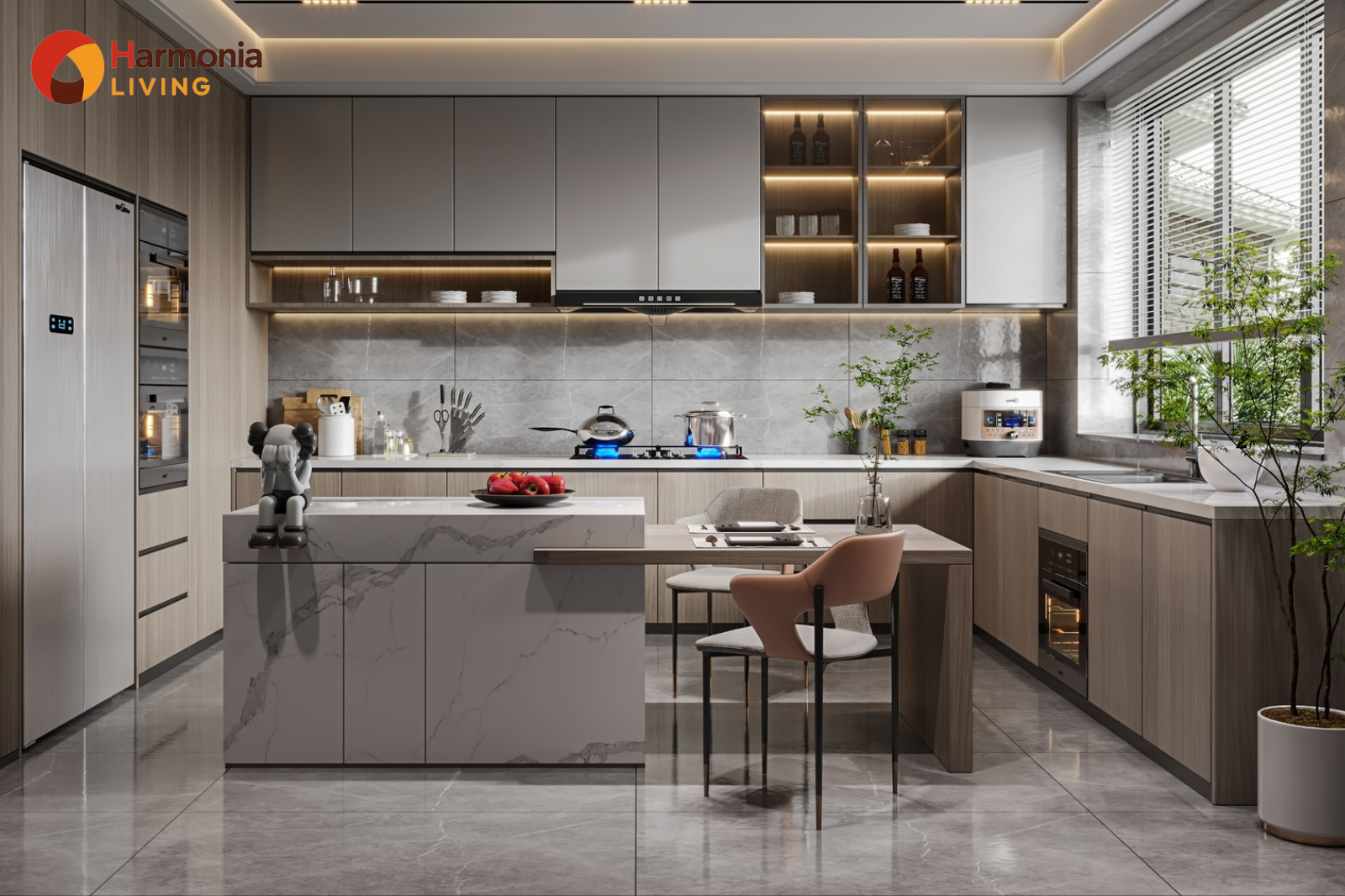 Bếp là khu vực sinh nhiệt cao, vì vậy ánh sáng trong thiết kế Harmonia Living phải đủ sáng nhưng không tăng nhiệt.