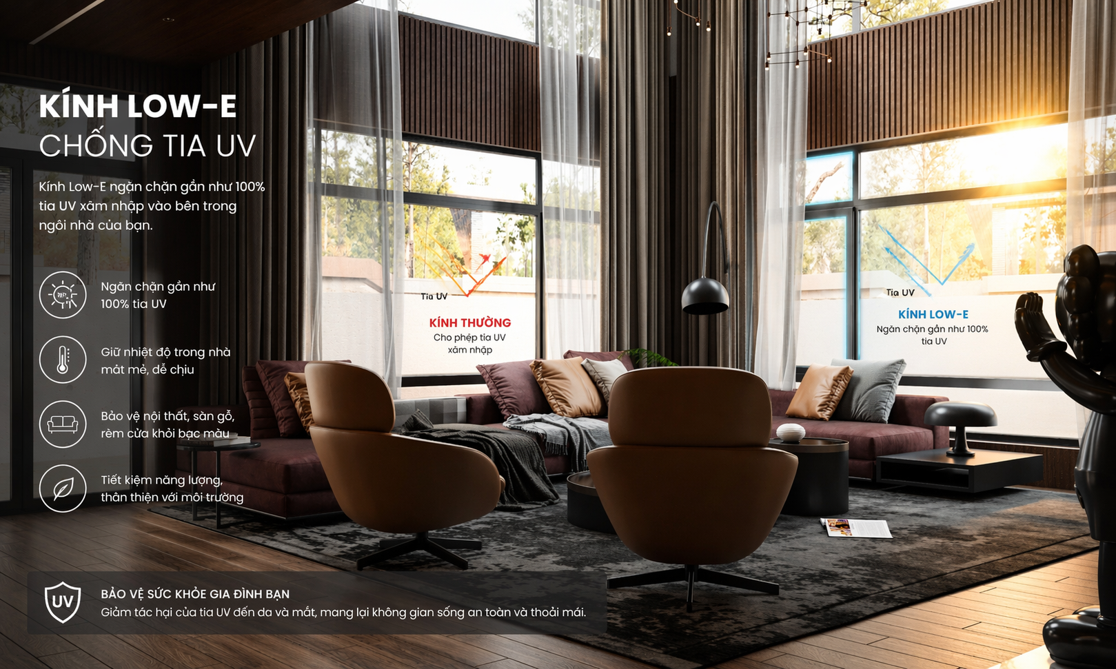 Kính Low-E (Low Emissivity) là loại kính được phủ một lớp kim loại siêu mỏng giúp giảm truyền nhiệt, chống tia UV và tối ưu ánh sáng tự nhiên. Đây là giải pháp vật liệu hiện đại, đặc biệt phù hợp với khí hậu nóng ẩm như Việt Nam.